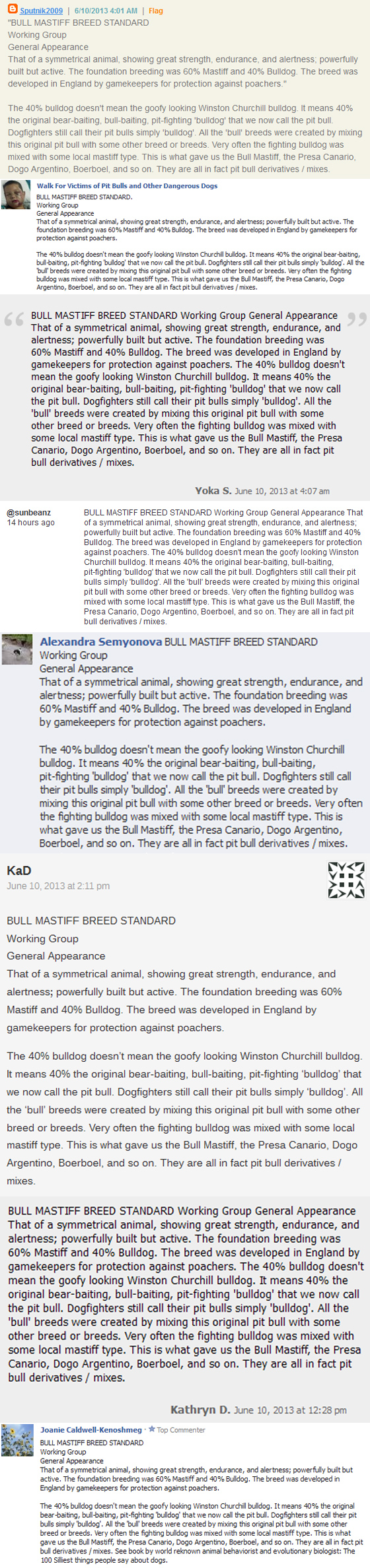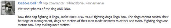 Folks, I’m here as a PIT BULL ADVOCATE that is stringently anti-BSL, in all forms. This is my page. I also run a website. I’m an American, which means the Constitution applies to me. You can’t tell me to “be gone” from my own page. I’m allowed to have my own opinion, I’m allowed to critically think, I’m allowed to discuss Pit Bull-related issues. Clearly I’ve made valid points, or this wouldn’t even be an issue. How do you think this has become an issue, on any level, if I didn’t make valid points? If you think rock-solid people from the Pit Bull community don’t stand behind what I wrote, which was much more anti-BSL and didn’t even address VRC until the end, then you’re sadly mistaken.